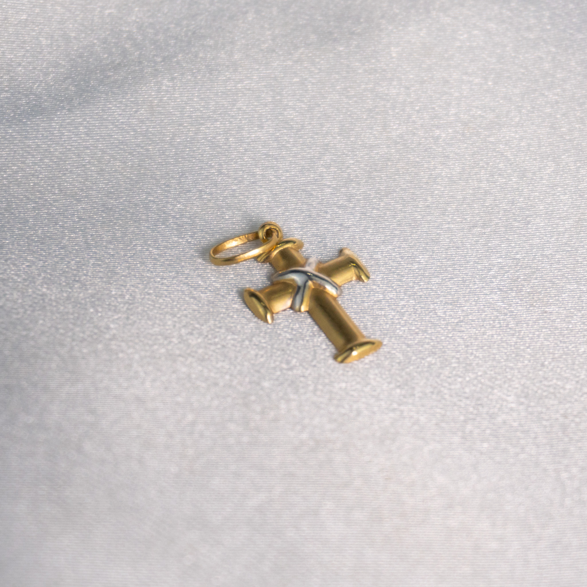 Pingente masculino em formato de cruz com detalhe de nó no centro, com acabamento delicado e elegante. A peça possui partes vazadas e trabalhadas, trazendo um visual moderno e diferenciado. Modelo leve e confortável, ideal para usar com correntes, sendo um símbolo de fé com estilo discreto.